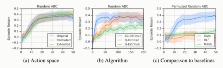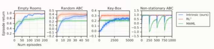 图11中展示的是与策略转移(Policy Transfer)方法(比如:MAML、RL2)的实验比较结果,可以看出内部奖励方法的表现优于MAML,最终达到同RL2一样的效果。这是因为内部奖励方法需要从部分Episode中学习策略,而RL2有一个好的初始化策略。