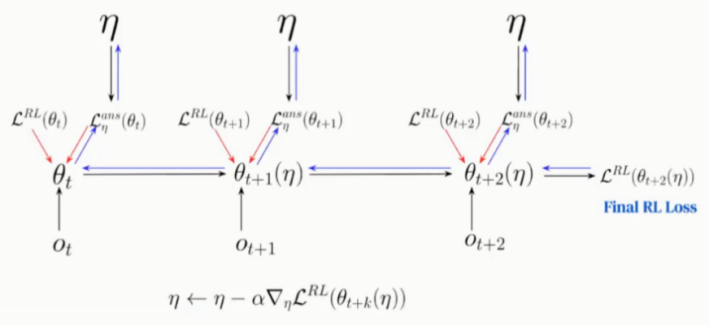 内部循环在强化学习中很常见,如图3所示,在展开的计算图中进行策略参数(q)更新,直到生命周期结束。外部循环是指在整个生命周期通过反向传播方法,更新内在奖励函数参数(h)。内在奖励函数可以是一个单独的神经网络或者是循环神经网络(RNN)。神经网络的节点与生命周期中各情节的行为历史对应,构成整个生命周期的行为历史。Meta-Gradient方法的核心思想是:在内部循环中的策略参数更新是关于内在奖励函数参数可微到。因此,如果我们能够展开计算图,在整个生命周期内更新策略参数(q),那么就可以通过这个巨大的计算图反向传播计算关于内在奖励函数参数(h)的Meta-Gradients。