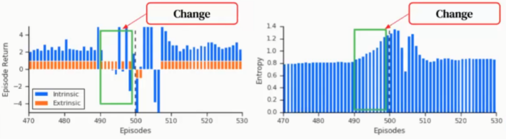 右侧图展示了整个过程策略的Entropy变化,可以看到在前400个Episodes中Entropy一直保持很小,当内部奖励为负值时,智能体不知道任务会如何改变,因此它的Entropy开始增加。紧接着,智能体可以快速学习到这些改变,做出策略调整,快速适应新的任务。