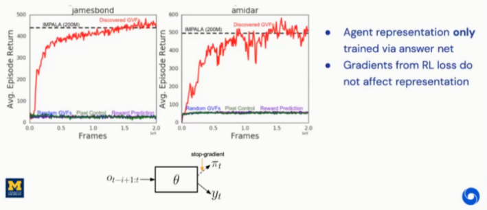 针对于如何在数据中发现问题作为辅助任务,他扩展通用辅助任务架构,参数化表示General Value Functions,并通过Meta-Gradient方法学习更新参数发现问题。实验证明这个方法可以快速发现问题来提高强化学习效果。