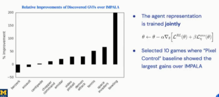 Satinder Singh教授分享了他的团队最近的两篇研究工作[1]和[2],讨论了如何将Meta-Gradient方法应用的学习发现强化学习智能体中的内在奖励和辅助任务问题中。并通过实验证明通过数据驱动的方式可以发现很多有用的知识来优化强化学习效果。