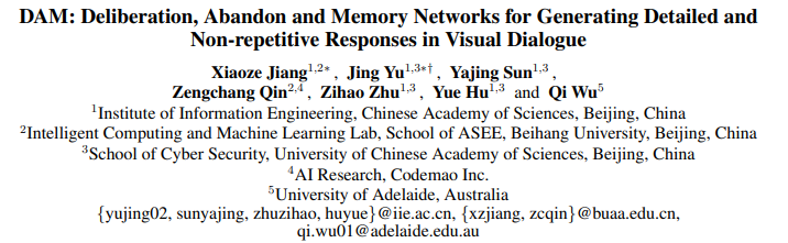 本文介绍的是 IJCAI-2020论文《DAM: Deliberation,Abandon and Memory Networks for Generating Detailed and Non-repetitiveResponses in Visual Dialogue》,该论文由中科院信工所于静老师指导,由来自中科院信工所、北京航空航天大学、阿德莱德大学的作者(蒋萧泽、于静、孙雅静、秦曾昌、朱梓豪、胡玥、吴琦)共同合作完成。