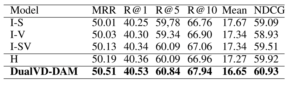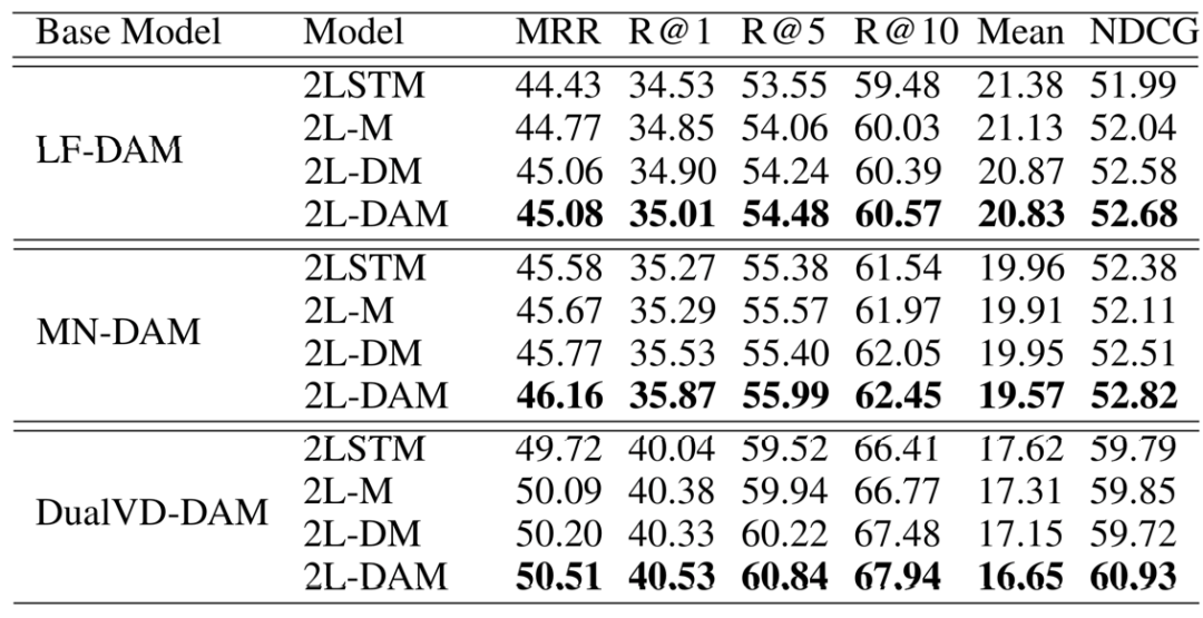 实验的总体结果如表1所示,LF-G、MN-G和DualVD-G是作者采用的基础模型(G代表对应的编码器和传统的生成式解码器搭配),LF-DAM、MN-DAM和DualVD-DAM是本文提出的模型。通过对表1的数据的分析可知:将传统的生成式解码器更换为DAM后,三个模型的表现均获得了提升;DualVD-DAM在大多数指标上达到了当前最好的结果。