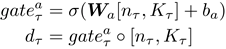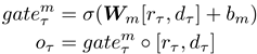 由于在生成每一个单词时都会对知识库(KB)中的信息进行更新,由推敲模块输出的知识信息Kτ中会包含与之前时刻生成的词相关的信息。放弃模块旨在过滤掉Kτ中的冗余信息,使最后生成的局部语义信息对于当前生成的词来说是特有的,能够更加捕获词粒度上的信息。放弃模块本质上是一个信息选择的过程,作者采用gate的方式获得最后的局部语义信息: