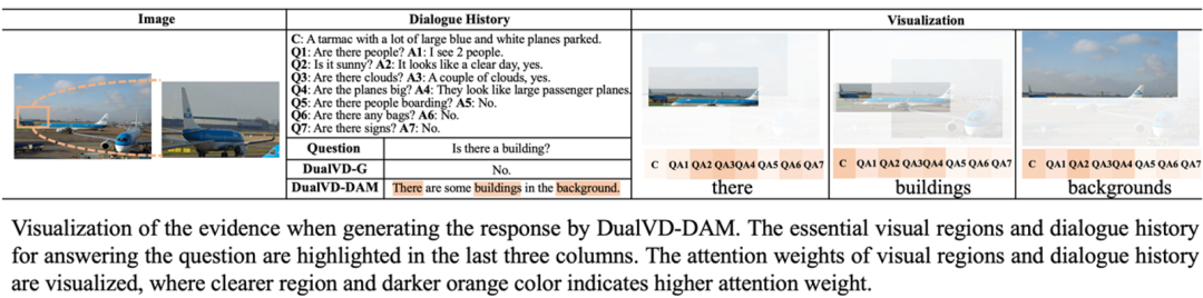 如图6所示,作者进一步通过可视化关键单词生成的过程中捕捉到的图像和历史的区域信息来验证模型信息选择的质量。以生成“backgrounds”为例,模型捕捉到了整个图像的背景区域,同时在对话历史中捕捉到了描绘背景天空以及天气情况的区域Q2A2。