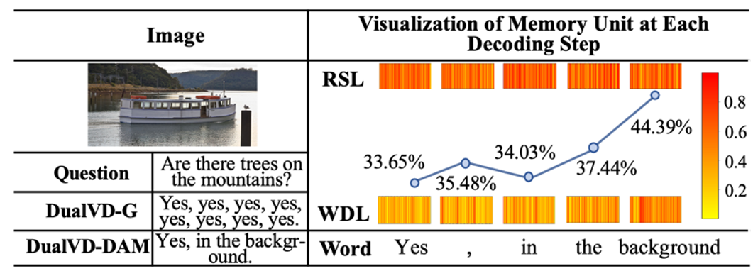 通过人工测评(表3)和案例分析(图5),作者发现与传统的生成式解码器相比,DAM可以有效的避免生成重复的单词,同时可以包含更多的细节信息。如图5中第一个例子:当问到“Q3: Is he giving attitude or having fun?”,DualVD-G生成了大量的重复单词,而DualVD-DAM通过“having fun”不仅仅回答正确了问题,而且进一步捕捉到了更多的细节信息“he looks like he is posing for the picture”。