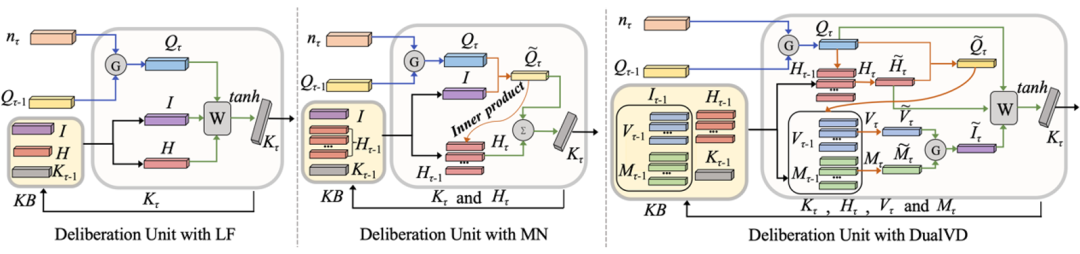 视觉对话领域大量的工作在编码器端已经对输入的信息进行了全面的分析和理解,在可以预见的未来编码器端还会出现更多、更强大的信息理解模式。为了使DAM更好的适应视觉对话领域在编码器端多样的信息理解和选择模型,推敲模块旨在自适应地根据编码器端对于信息选择的模式来获取和当前词相关的视觉和文本信息。整体来讲,推敲模块输入为当前词nτ,输出为与当前词相关的知识信息Kτ。