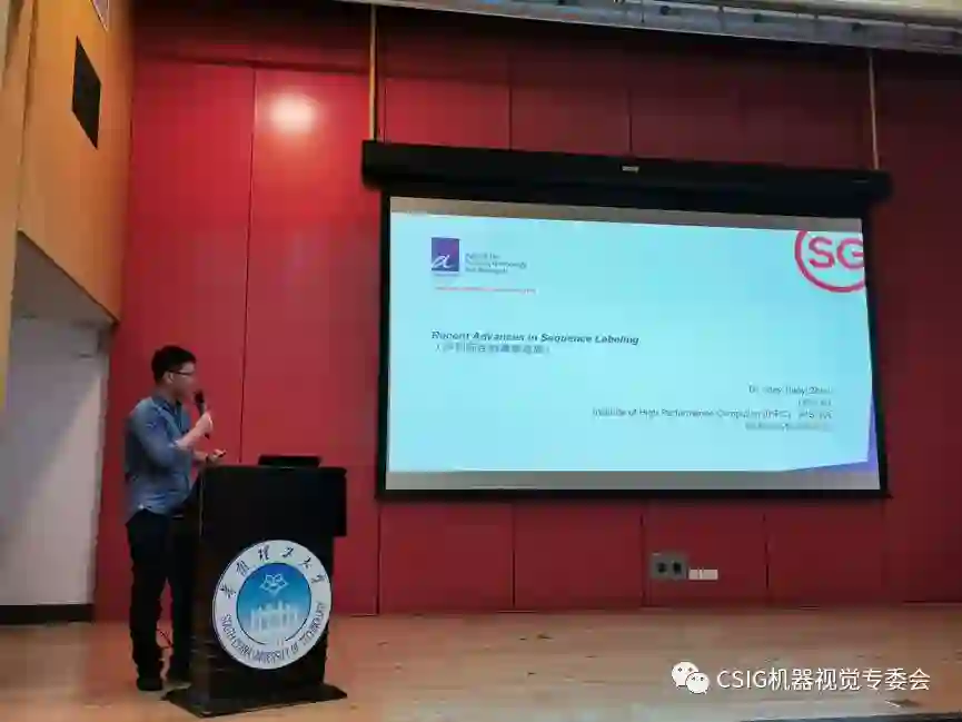接下来,来自新加坡科技研究局高性能研究所的周天异研究员为学员们带来了题为“序列标注的最新进展”的学术报告。周天异研究员首先介绍了序列标注的研究背景,包括词性标注、组块标注、命名实体标注,从传统方法、深度学习方法、迁移学习方法三个方面介绍了一些常用的序列标注模型。之后,周天异研究员指出序列标注的现有问题,并结合其团队近期工作深入浅出地阐述了这些问题的解决思路。在报告最后,周天异研究员针对深度模型训练调参困难的问题,总结其多年实验经验,为大家指明了模型训练的技巧。周天异研究员干货满满的报告引发了学员们的思考,他与现场的老师、同学们展开了热烈的讨论。