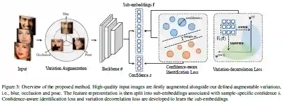 这篇论文被CVPR 2020接收,提出了一种面向深度人脸识别的通用表征学习框架,可以处理给定训练数据中未发现的较大变化,而无需利用目标域知识。新框架首先将训练数据与一些有意义的语义变化(例如低分辨率、遮挡和头部姿势)一起合成。训练过程中将特征嵌入拆分为多个子嵌入,并为每个子嵌入关联不同的置信度值,以简化训练过程。通过对变化的分类损失和对抗性损失进行正则化,可进一步对子嵌入进行解相关。实验表明,新的框架在LFW和MegaFace等常规人脸识别数据集上均取得最佳性能,而在TinyFace和IJB-S等极端基准集上则明显优于对比算法。