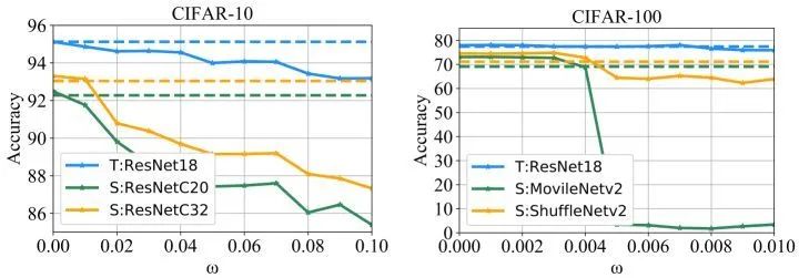 如下图所示是优化目标中式2中不同参数 的选择的影响。教师模型是 ResNet-18,学生模型使用 ResNet-C20 或者 ResNet-C32。实验发现: 越大,则教师模型变得越 toxic,蒸馏得到的学生模型的性能也就越差。但是随之而来的问题是教师模型的性能也会越来越差。