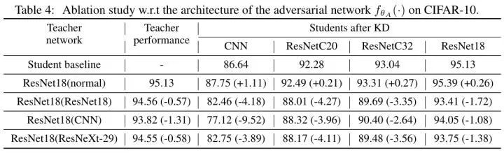 如下图5所示,展示了不同教师模型对应的 counterpart 模型结构的性能。训练方法对不同结构的 是具有泛化性的。比如我们正常训练教师模型 ResNet-18,并使用这个正常的教师模型进行知识蒸馏的话,学生模型 (CNN,ResNetC20,ResNetC32,ResNet18) 等都会涨点,说明知识蒸馏技术可以偷窃模型。但是若使用 ResNet18 作为 counterpart ,并使用这个 Nasty 的教师模型进行知识蒸馏的话,学生模型 (CNN,ResNetC20,ResNetC32,ResNet18) 等都会掉点。
