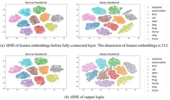 Nasty 教师模型的 ResNet-18 和正常教师模型的 ResNet-18 的特征空间类间距离表现相似,这与我们的目标一致,即 Nasty 教师模型应该表现得与正常教师模型相似,这也说明了为什么Nasty Teacher的精度和正常的差不多。但是输出 logits 有很大的偏移。