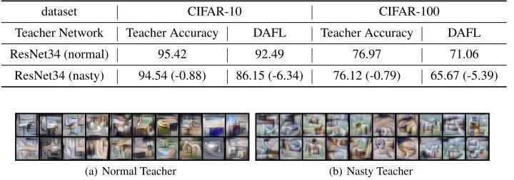 教师模型和学生模型分别设置为 ResNet-34 和 ResNet-18。超参数设置为 。对于 CIFAR-10 数据集,使用正常 ResNet-34 为教师模型,在无数据情况下,学生模型可以获得92.49% Accuracy。但是若使用 Nasty 的 ResNet-34 为教师模型,在无数据情况下,学生模型只可以获得86.15% Accuracy,体现出 Nasty 教师模型对知识产权的保护作用。