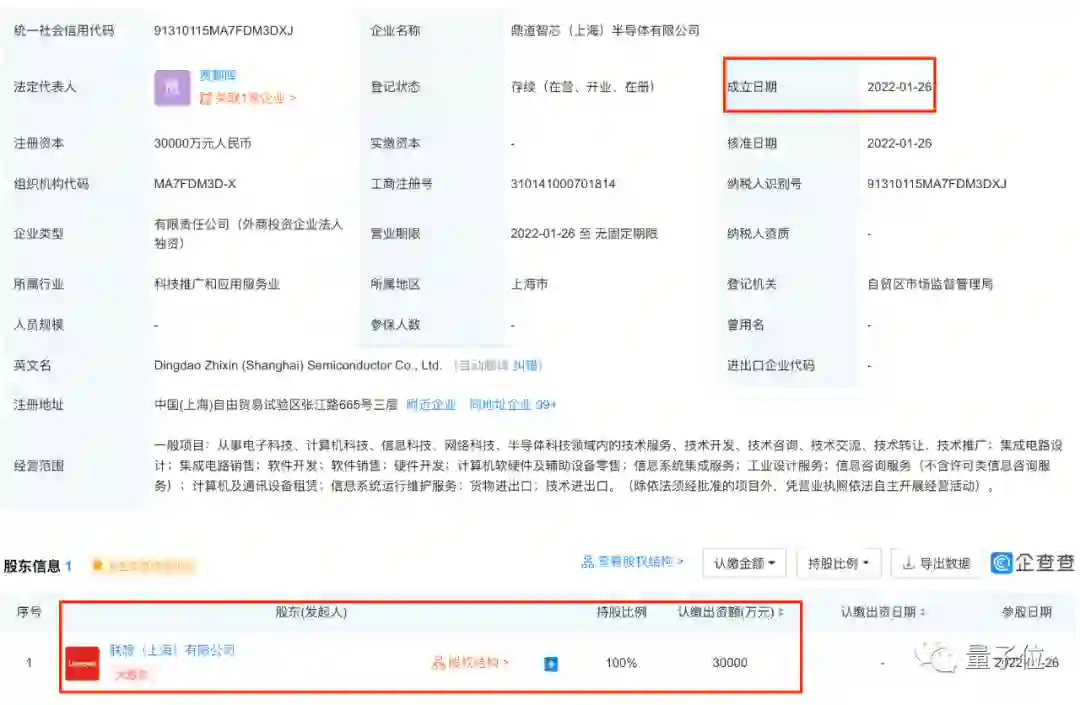 由联想100%控股,名为鼎道智芯(上海)半导体有限公司现已正式成立: