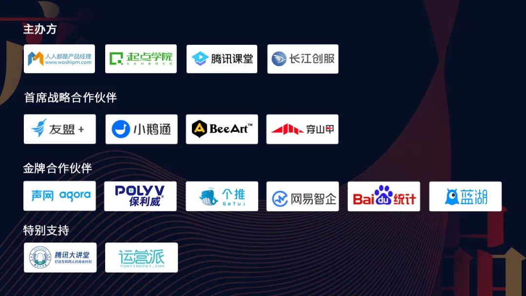 感谢联合主办方腾讯课堂、长江创服,首席战略合作伙伴友盟+、小鹅通、BeeArt、穿山甲的大力支持。
