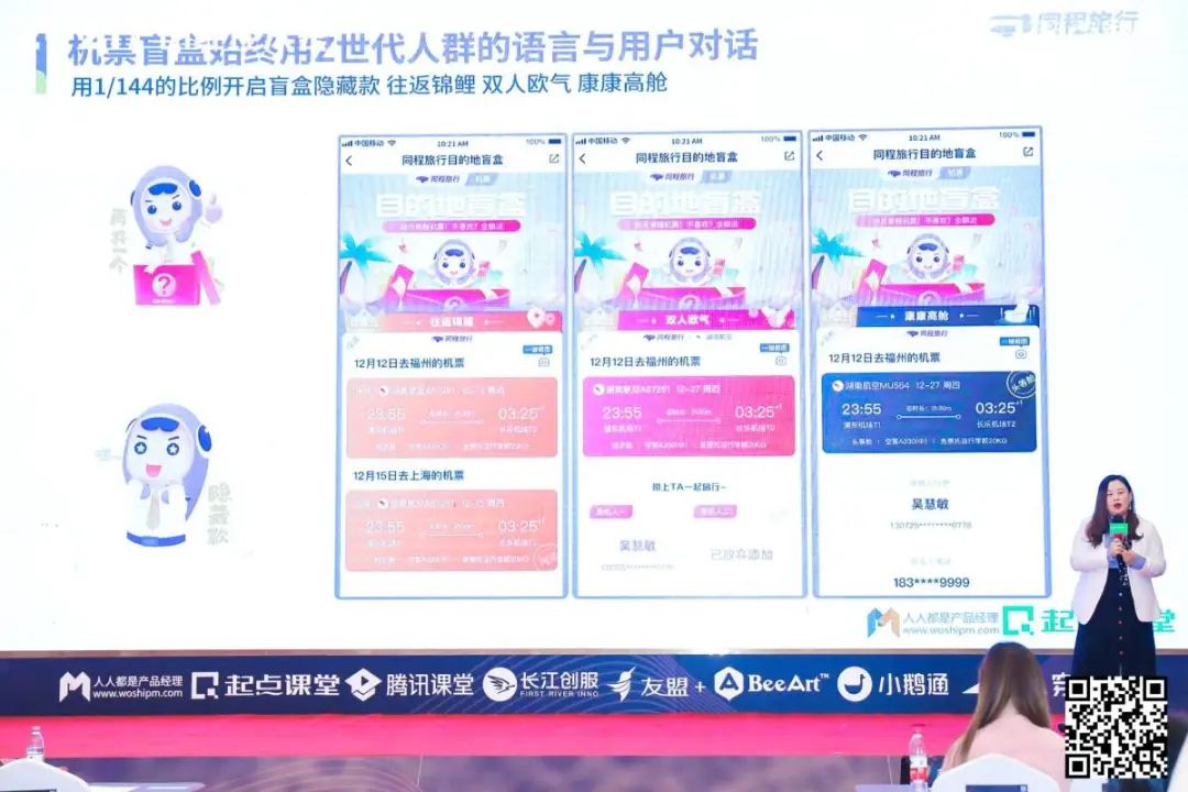第三位分享嘉宾是同程艺龙机票事业群产品中心负责人张超,她分享的主题是《从机票盲盒看增长团队》。