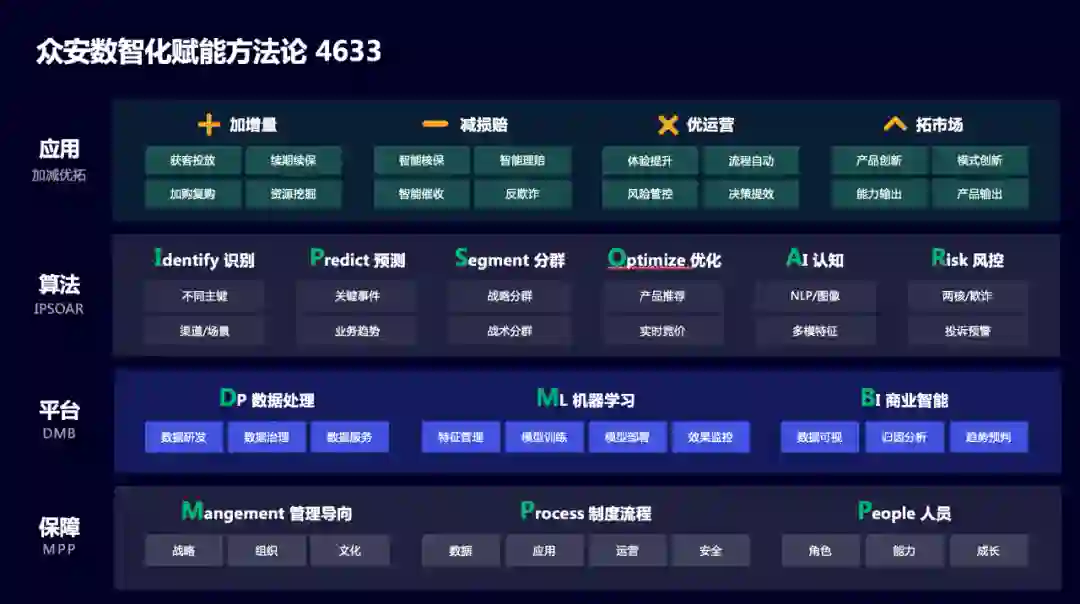 。在这套方法论中,算法层囊括的是一个一个的原子能力,是未经封装的机器。平台将这些机器打包成模块,供业务层以搭积木的形式调用,从而实现加增量(获客、加复购、挖掘用户价值)、减损赔(风险控制)、优运营(提升运营决策效率)、拓市场(为业务创造新产品,如新险种)的应用价值。更重要的是,这套方法论以及其中的产品(包括鲸探、集智)不止应用于众安内部,还通过轻咨询服务、平台建设、模型应用三个维度面向行业输出。