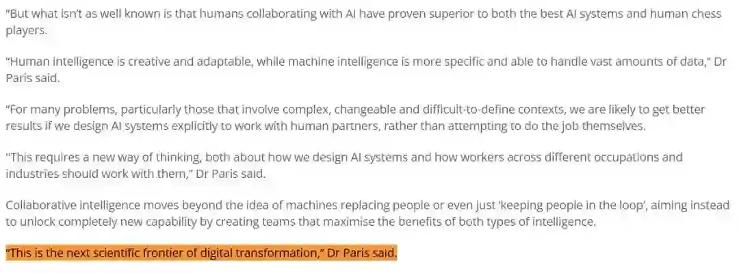 如今,这种观点正在被越来越多的业内人士所接受,「协作智能(Collaborative Intelligence)」的概念也开始受到更多关注。澳大利亚最大的国家级科研机构——CSIRO 首席研究科学家 Cécile Paris 甚至指出,「