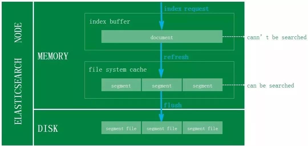 对于 ES 的写入机制有了解的同学可能会知道,新增的文档会被收集到 Indexing Buffer,然后写入到文件系统缓存中,到了文件系统缓存中就可以像其他的文件一样被索引到。