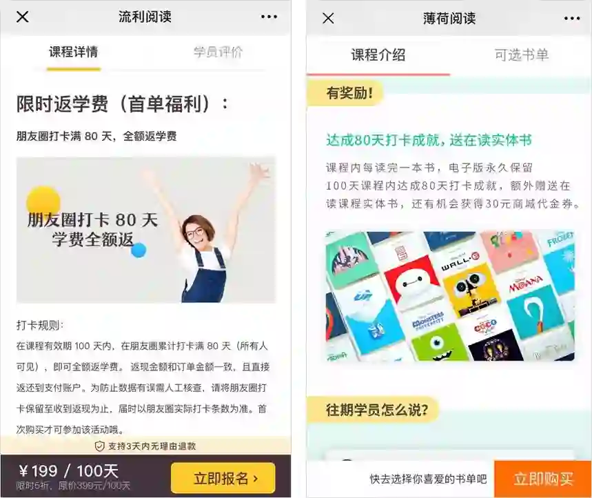 目前这类产品的利益诱导主要有两种模式,一种是以流利阅读为代表的“坚持打卡返学费”模式,一种是以薄荷阅读为代表的“坚持打卡送优惠券”模式。