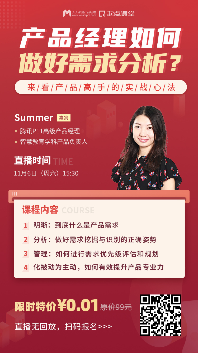 为了帮助更多0基础或入行不久的产品新人快速了解产品经理必备技能和知识,人人都是产品经理社区&起点课堂特邀腾讯P11高级产品经理@Summer老师,在线1小时结合自己在腾讯近10年的产品经验,为你剖析需求分析常见误区,教你如何进行有效的需求分析,拆解优秀产品经理的能力构成,帮助大家搭建个人能力体系。