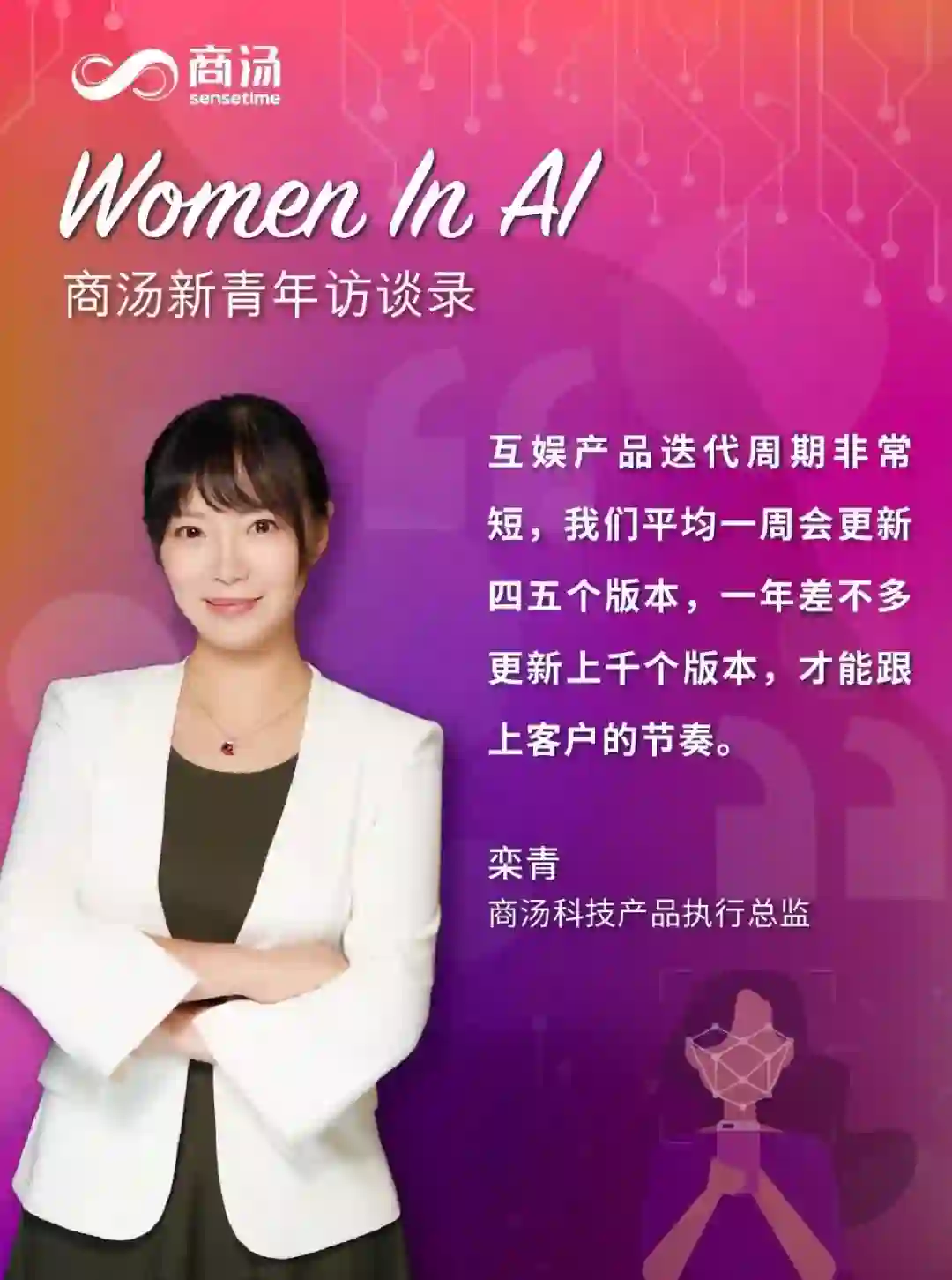 本期《商汤新青年访谈录》,商汤君采访了商汤产品执行总监、增强现实感视频平台负责人栾青博士,来听一听她对这些现象级产品逻辑的解读,以及她如何发挥她女性产品经理的优势。