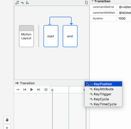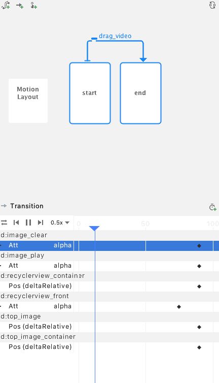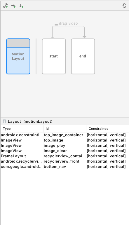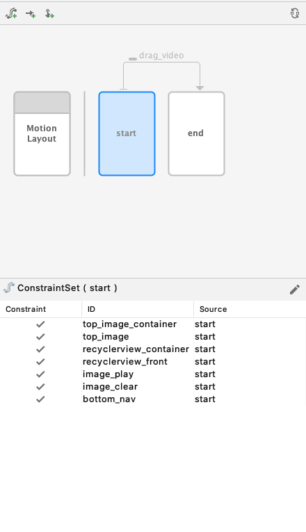 图中的 MotionLayout Scene 中有 start 和 end 两个 ConstraintSet,它们之间有一个 Transition 效果