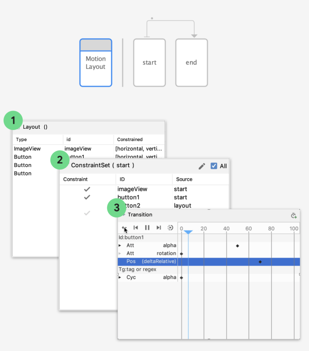 MotionLayout 可以对布局的变化做动画处理,在编辑器中该动画可被指定为 ConstraintSets 中的 Transition 效果。Motion Editor 可以通过 Overview 面板将这些状态的转变可视化。要编辑 ConstraintSet 中的约束,点击 Overview 面板中相应的选项即可。