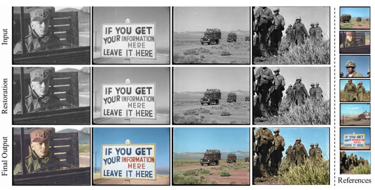 以下是DeepRemaster修复的效果图:(右侧为参考彩色图像)