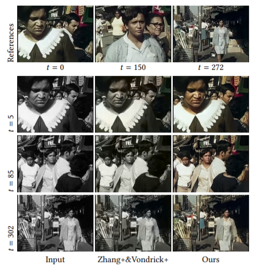 另外,作者将Zhang和Vondrick的修复方法结合,并进行了比较。上部图像为参考彩色图像,分别对第5、85、302帧的图像进行了修复,结果可以看出目前的方法在着色效果上更好。