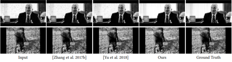 Zhang、Yu和Vondrick等人曾对世界经典电影和和Youtube视频进行AI修复试验,结果取得了不错的效果。作者为验证DeepMaster的修复性能,与之进行了对比。