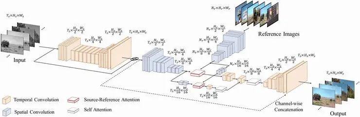 在模型Input端输入黑白图像,经过时间卷积网络的预处理和Source-Reference注意力机制的深度训练后,可以结合任意数量的彩色图像来生成最终的色度信道。在这一过程中, Source-Reference注意力机制允许模型再给视频上色时,参考彩色图像(Reference Images)中的相似区域。