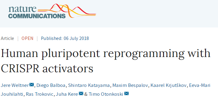 7月6日,发表在Nature Communications杂志上题为“Human pluripotent reprogramming with CRISPR activators”的研究中,由赫尔辛基大学Timo Otonkoski博士带领的团队首次通过激活细胞自身的基因将皮肤细胞转化成了多能干细胞。