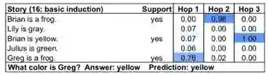 每一列代表一个样本,黑色字体的句子为已知事实,蓝色字体的句子为问题,红色字体标出的是答案。解决这类问题的一般策略为根据答案在已知事实中逆向回溯寻找答案(backward chaining,回退式链式推理)。下表给出各个模型的准确率对比: