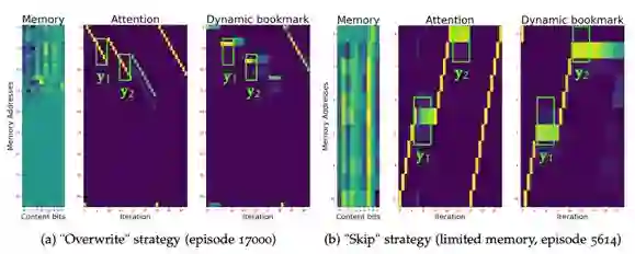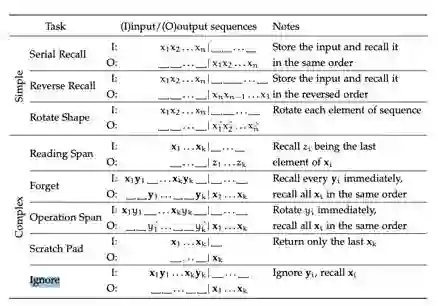 这个实验是关于改进的NTM模型进行的。下面的表格展现的是神经科学中常用的测试记忆能力的实验示意,以接下来要说明的任务“Ignore”为例,表格中这一行中标识代表在不同时刻的输入,