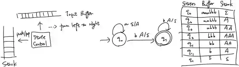 从形式语言的角度来说,上下文无关文法(CFG)以及其对应的PDA可以建模程序语言,能够处理递归文法结构,下图简单的以计算表达式的解析(parsing)来举例: