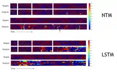 可以发现NTM模型拟合数据集收敛速度更快,一定程度上反映其学习能力较强。对输入输出向量序列进行可视化,可以得到下图: