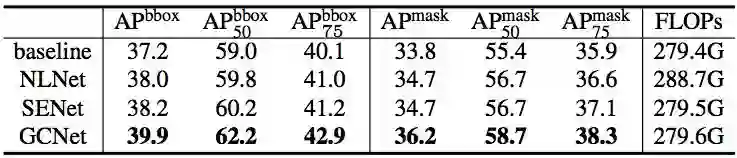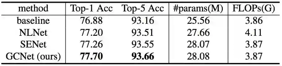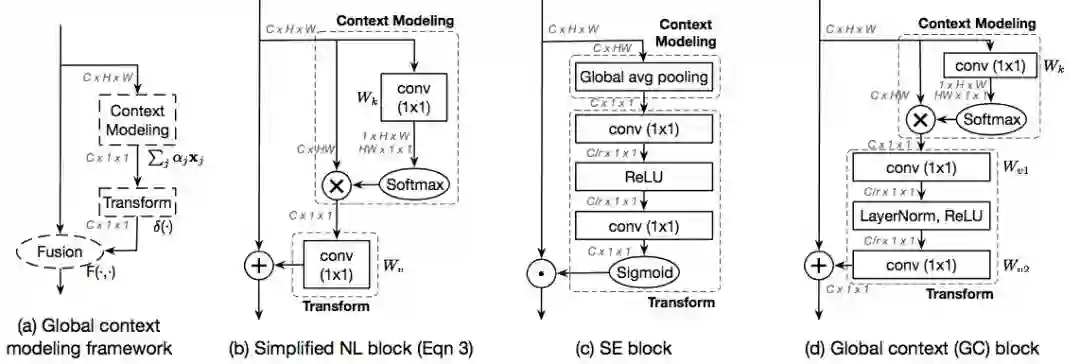 此外,作者发现这个简化版的 NLNet 与流行的 Squeeze-Excitation Network(SENet)具有相似的结构。作者将他们抽象为一个通用的全局上下文建模框架,主要分为以下三个模块:(a)上下文建模模块,它将所有位置的特征聚合在一起形成一个全局上下文特征;(b)特征转换模块,用于捕获通道间的相互依赖性;(c)融合模块,将全局上下文特征与所有位置的特征进行融合。其中简化版的 NLNet 与 SENet 均是此全局上下文建模框架的实例。