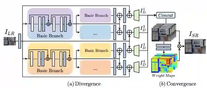 作为不适定问题,超分辨率任务的挑战是对于一个给定的低分辨率输入可以有多种预测。一些经典的基于深度学习的方法缺乏对底层高频分布的明确建模,导致结果模糊不清。我们提出先发散再收敛的 D2C 结构,以离散的形式学习底层高频细节的分布。在发散阶段,我们提出了一个基于树状结构的深度网络;在收敛阶段,我们分配空间权重来融合这些发散的预测结果。我们在真实世界的超分辨率数据集进行了评估,包括一个新提出的具有 8 倍缩放系数的数据集。我们的实验表明,D2C-SR 具有更高的评价指标,而参数数量明显减少。