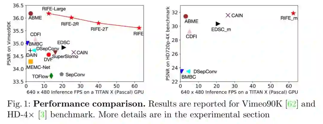 RIFE 在处理速度上具有显著优势,如下图,横轴是每秒能处理的视频帧数,纵轴是质量指标。