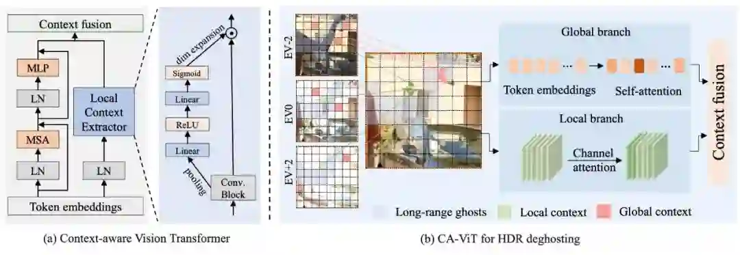 受限于卷积操作的感受野,已有基于 CNN 的多曝光 HDR 成像算法容易在具有大前景运动和严重过曝的场景下产生运动鬼影和强度失真。为了同时建模长距离的前景运动鬼影和局部的多帧融合,本文对原始 Transformer 进行改进,提出一种基于上下文感知的双分支 Transformer (CA-ViT),能够同时建模全局和局部图像上下文信息。更进一步地,本文将所提出的 CA-ViT 作为基础组件,提出首个基于 Transformer 的 HDR 去鬼影模型 HDR-Transformer 。在多个公开数据集上的试验结果证明,本文的方法能够更有效地去除鬼影,恢复图像质量更好的 HDR 结果。