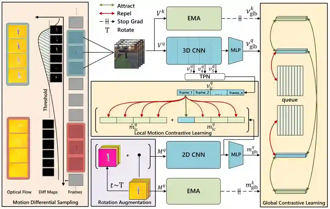 自监督学习在视频表征学习中表现出了很大的潜力,其中短程的局部动态特征学习对于后续下游任务有至关重要的意义,然而现有方法对于提取这类信息没有充分的讨论。我们在本论文中提出了运动敏感对比学习 (MSCL) 来将运动信息从光流结果引入到 RGB 图像中。为此,在视频片段的对比学习之外,我们提出了局部动态对比学习 (LMCL) 来提取两种模态之间的帧级信息。同时,我们引入了光流旋转增强方法来产生额外的负样本,利用动态差分采样来寻找难样本对。我们的实验结果是,3D ResNet-18 在 UCF101 上达到了 91.5% 和在 Something-Something v2 上达到了 50.3% 的分类准确率,在 UCF101 上达到了 65.6% 的视频检索准确率。