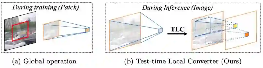 本文揭示了图像复原任务中全局操作的训练-测试不一致现象:训练时基于裁切图像的全局信息分布和推理时基于全图的全局信息的分布并不一致。为了缓解不一致性对性能的负面影响,本文提出了测试时局部转换器:在模型推理时将操作的信息聚合范围从全局(整个空间维度)转换为局部窗口。该方法无需任何微调,可以直接应用于已有模型并提升其在多种图像恢复任务上的性能。例如,该方法将 Restormer 在 GoPro 图像去模糊数据集的 PSNR 从 32.92dB 提高到 33.57dB 。代码已开源: