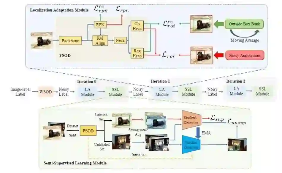 弱监督物体检测任务(WSOD)旨在仅利用图像级别的类别标签来训练一个检测器。几年来,一些弱监督检测方法试图从原始的 WSOD 模型中挑选高质量的伪标注来提升模型性能。然而,这些方法仅仅根据图片级的线索,简单的将带有伪标注的训练集数据集划分为有标签集和无标签集,而忽略了每一个检测框的分类信息和定位信息,因此信息没有得到充分利用。在本工作中,我们提出将弱监督信号转化为带噪监督信号的目标检测算法(W2N),该算法包含两个迭代训练的子模块。我们的算法充分考虑了每一个检测框具有的信息,并提出了一个正则化损失来缓解WSOD会集中注意到"discriminative part"的问题。实验结果显示,我们的方法在 PASCAL VOC, COCO 等数据集上都达到了 SOTA 。