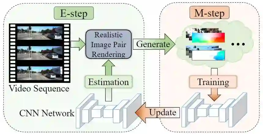 从视频中获取光流标注是非常困难且昂贵的。现有光流估计模型通常使用渲染数据集进行训练,导致其在真实世界应用中的性能较差。本文提出一种基于 EM 算法的框架从任意的真实视频中直接生成光流训练数据集。我们首先从视频序列中的参考帧和目标帧中估计一个光流,然后基于此生成一张新的图片以替换目标帧,从而构成一个训练数据对。我们提出了一个 RIPR 模块来解决图像生成过程中的伪影和空洞填充问题,使得生成的图像更加真实。进一步地,我们提出使用 EM 算法对生成的数据和光流估计网络进行迭代优化。在 E-step 中,我们使用光流估计网络生成训练数据集;在 M-step 中,我们使用生成的数据集对光流网络进行训练。通过多次迭代,生成数据集和光流估计网络能够得到同时优化。实验证明,本文的方法比现有的数据集生成方法效果更好。同时,我们在和强监督、无监督算法的对比中都达到了领先水平