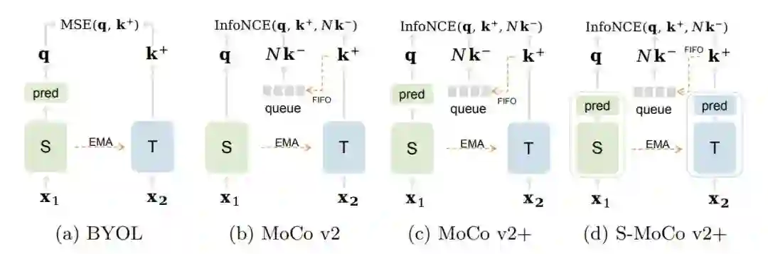 本文探索了自监督领域基于增广不变特征学习框架中的关键因素。我们建立了 MoCo 和 BYOL 公平对比的 benchmark ,详细研究了预训练模型设计的关键因素对模型在上游和下游任务上的性能影响,主要有以下几个结论:更复杂的模型设计可以提高上游任务的性能,但 linear evaluation 对下游性能没有指示性;在上下游使用不匹配的训练器会影响下游任务的性能。由此,我们提出了简单有效的 NormRescale 来解决这个问题;BYOL 的非对称设计移植到 MoCo 上能够提高上游结果,但会影响下游长尾分类任务的性能。我们希望这项研究能为自监督模型设计带来启发。