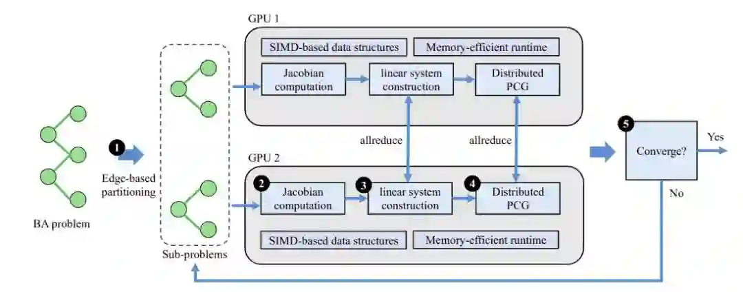 Bundle Adjustment 是现代 SLAM 以及 SfM 应用中极为重要的算法,它通常会计算三角化得到的坐标估计数据重新投影到相机成像平面并计算与真实拍摄的像素坐标之间的误差,用此误差优化估计坐标和相机位姿。Bundle Adjustment 的优化过程极为耗时,且通常会消耗大量内存,本文使用 GPU 对整个 Bundle Adjustment 过程加速,同时提出了一个新的分布式策略,可以将问题自动拆分到若干 GPU 中以便于将巨大的内存开销分摊到若干 GPU 中,且与已有的分布式策略相比我们的策略不会做任何近似。在 BAL 数据集上,MegBA 相比 CPU 库取得高达 60 倍的加速,相比 GPU 库取得高达 6 倍的加速,同时 MegBA 还能处理十亿条边以上的超大规模数据,而现有的 CPU 和 GPU 框架在此规模上均会崩溃。
