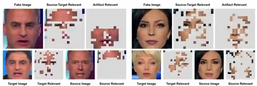 ① 深伪检测模型将伪造图像中同源图像和目标图像特征无关的图像区域判定为 Artifact 区域;