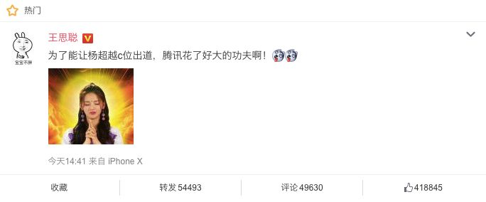对此,王思聪还在微博中回应:“为了能让杨超越c位出道,腾讯花了好大的功夫啊!”