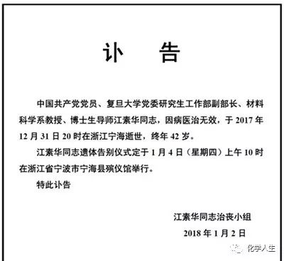 复旦大学党委研究生工作部副部长、材料科学系教授、博士生导师江素华教授,因病医治无效,于2017年12月31日20时不幸辞世。